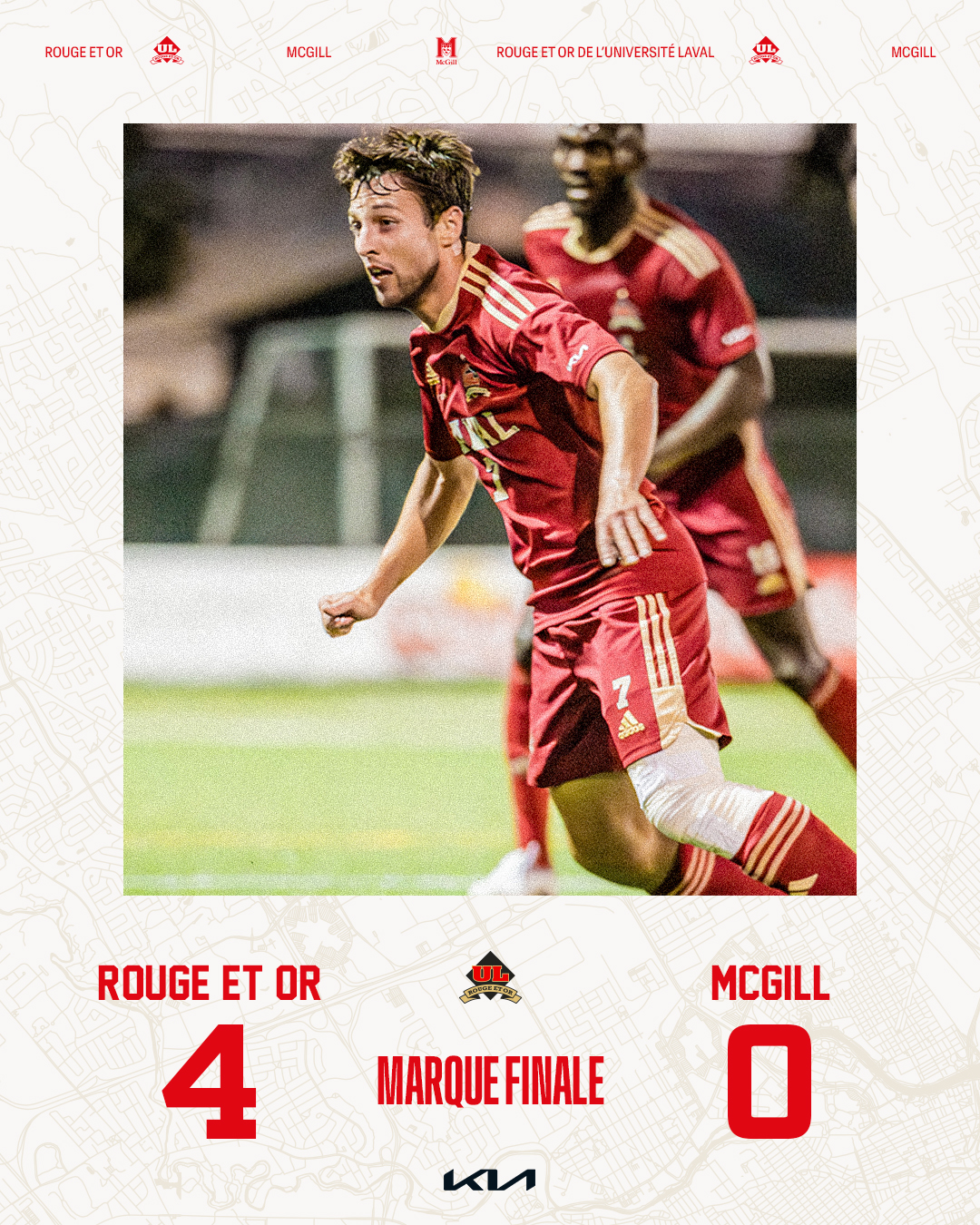Les Lavallois ont frappé tôt dans le match, alors qu’Emmanuel Faivre-Duboz a ouvert la marque d’une superbe frappe à la 5e minute. Concordia a toutefois répliqué à la 21e pour créer l’égalité. Le Rouge et Or s’est rapidement ressaisi en reprenant les devants peu avant la mi-temps. Arnaud Desrosiers s’est ensuite illustré en effectuant un superbe arrêt sur un penalty des Stingers. En deuxième demie, la troupe lavalloise a poursuivi sur sa lancée et a inscrit un troisième but en fin de rencontre pour sceller la victoire.