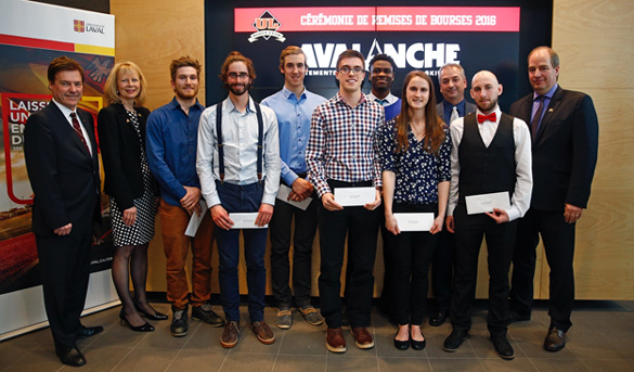 M. Yves Bourget, président-directeur général de la Fondation de l’Université Laval, Mme Josée Germain, vice-rectrice à l’administration et aux finances de l’Université Laval, William Mercier-Robin (ski alpin, études libres), Conor Thompson (ski de fond, biologie), Alexis Morin (ski de fond, kinésiologie), Philippe Giguère (badminton, pharmacie), Vladimir Thomas (basketball, études libres), Geneviève Gagné (athlétisme, physiothérapie), M. Simon Bernier, directeur de production Asie chez Avalanche, Alex Bussières (intervention sportive) et M. Christian Gagnon, directeur du Service des activités sportives. Les sept boursiers ont partagé 6000 $ en bourses.