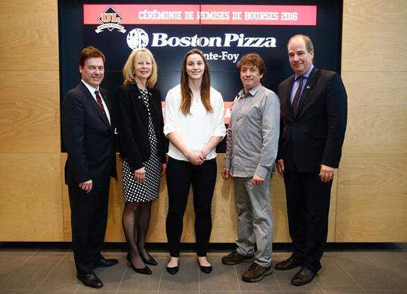 M. Yves Bourget, président-directeur général de la Fondation de l’Université Laval, Mme Josée Germain, vice-rectrice à l’administration et aux finances de l’Université Laval, Camille Provençal-Aubé (rugby, sciences infirmières), récipiendaire d’une bourse d’excellence de 1000 $, M. Patrice Michel, associé chez Boston Pizza Ste-Foy et M. Christian Gagnon, directeur du Service des activités sportives.