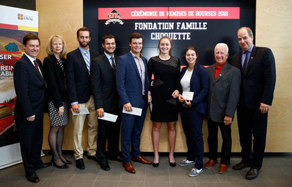 M. Yves Bourget, président-directeur général de la Fondation de l’Université Laval, Mme Josée Germain, vice-rectrice à l’administration et aux finances de l’Université Laval, Émile Provost (golf, administration des affaires), Jean-Philippe Prémont (golf, administration des affaires), Adam Poulin (golf, administration des affaires), Catherine Gariépy (golf, sciences biomédicales), Élisabeth Asselin (golf, éducation physique et à la santé), M. Paul Choquette, directeur général de la Fondation Famille Choquette et M. Christian Gagnon, directeur du Service des activités sportives. Les étudiants-athlètes ont reçu un appui financier de 4000$ chacun sur deux ans pour l’excellence sportive et le leadership. La contribution totale de la Fondation Famille Choquette envers le Club de golf Rouge et Or s’élève à 300 000 $. Jusqu’en 2020, la Fondation Famille Choquette remettra annuellement 50 000 $, soit 20 000 $ en bourses, 25 000 $ servant à assurer une diminution des frais annuels demandés aux étudiants pour leur participation, et 5000 $ pour contribuer aux besoins de l’équipe.