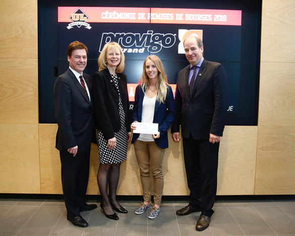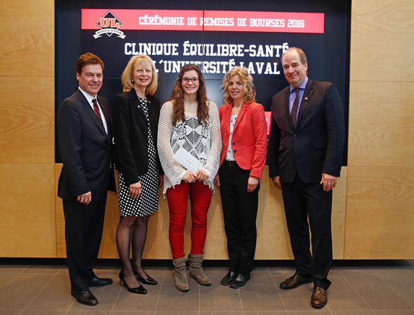 M. Yves Bourget, président-directeur général de la Fondation de l’Université Laval, Mme Josée Germain, vice-rectrice à l’administration et aux finances de l’Université Laval, Fabiola Forteza (rugby, kinésiologie), récipiendaire d’une bourse de 500 $ pour son excellence sportive et son leadership, Dre. Vicky Drapeau, professeur agrégée au Département d’éducation physique et représentante de la Clinique Équilibre-Santé de l’Université Laval et M. Christian Gagnon, directeur du Service des activités sportives.