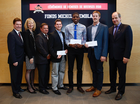 M. Yves Bourget, président-directeur général de la Fondation de l’Université Laval, Mme Josée Germain, vice-rectrice à l’administration et aux finances de l’Université Laval, M. Michel Tremblay, vice-président exécutif, Placements à l’Industrielle Alliance, Assurance et services financiers, Philippe Renaud (soccer, administration des affaires), Marc-Olivier Kouo Dibongue (soccer, génie civil), Thibaud Dezutter (basketball, biologie) et M. Christian Gagnon, directeur du Service des activités sportives. Par la création du Fonds en leadership et implication sportive Michel-Tremblay, un montant équivalent aux frais de scolarité de l’année 2015-2016 a été remis à chaque étudiant, pour un total de plus de 8700 $ en bourses.
