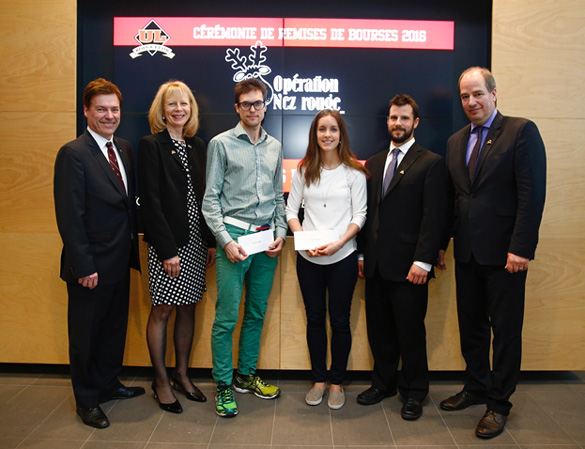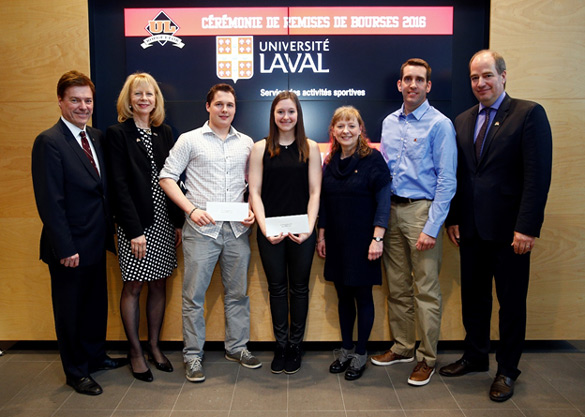 M. Yves Bourget, président-directeur général de la Fondation de l’Université Laval, Mme Josée Germain, vice-rectrice à l’administration et aux finances de l’Université Laval, Jean-Patrick Fortin-Cantin (badminton, kinésiologie), Frédérique Desbiens (cheerleading, génie industriel), Lynda Archambault, surintendante et représentante du Service des activités sportives, Mathieu Nadeau, surintendant et représentant du Service des activités sportives et M. Christian Gagnon, directeur du Service des activités sportives. Les deux boursiers ont reçu une bourse de 1000 $.