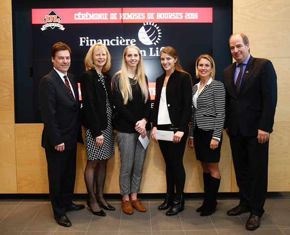 M. Yves Bourget, président-directeur général de la Fondation de l’Université Laval, Mme Josée Germain, vice-rectrice à l’administration et aux finances de l’Université Laval, Cynthia Turcotte (soccer, sciences de la consommation), Anne-Charlotte Beaulieu (rugby, administration des affaires), Mme Marie-Ève Poulin, directrice adjointe à la Financière Sun Life et M. Christian Gagnon, directeur du Service des activités sportives. Chacune des boursières a reçu une aide financière de 1000 $.