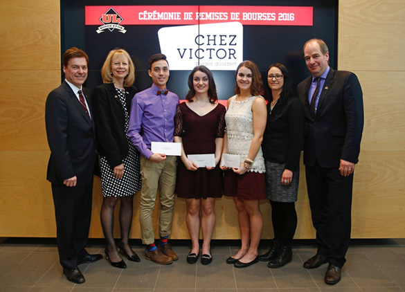 M. Yves Bourget, président-directeur général de la Fondation de l’Université Laval, Mme Josée Germain, vice-rectrice à l’administration et aux finances de l’Université Laval, Vincent Hoa Mai (athlétisme, médecine), Virginie Savard (badminton, médecine), Laurence Côté (natation, physiothérapie), Mme Isabelle St-Georges, directrice des opérations et du marketing de Chez Victor et M. Christian Gagnon, directeur du Service des activités sportives. Chacun des boursiers a reçu une aide financière de 1000 $ pour son excellence académique et sportive, et son leadership.
